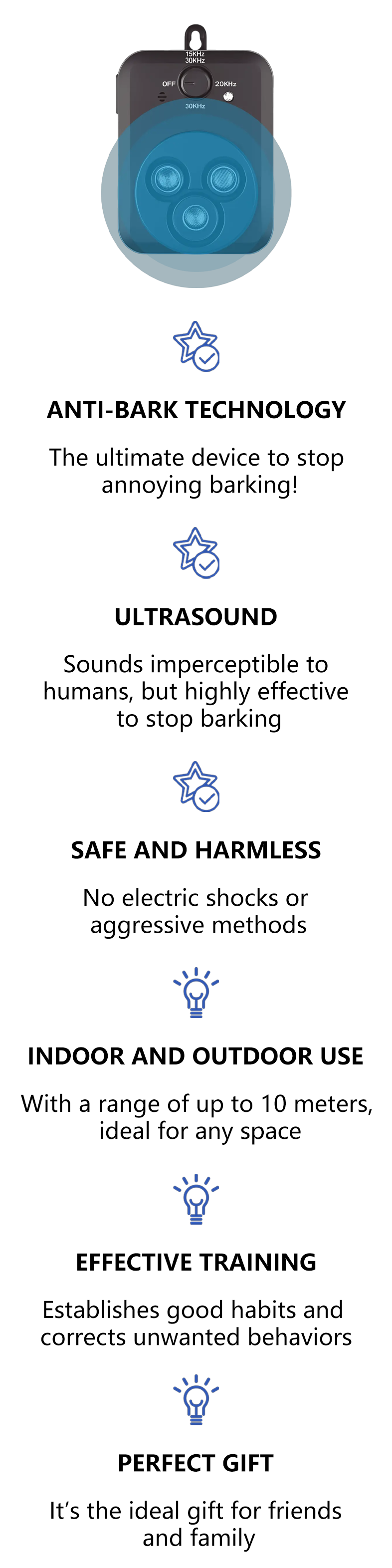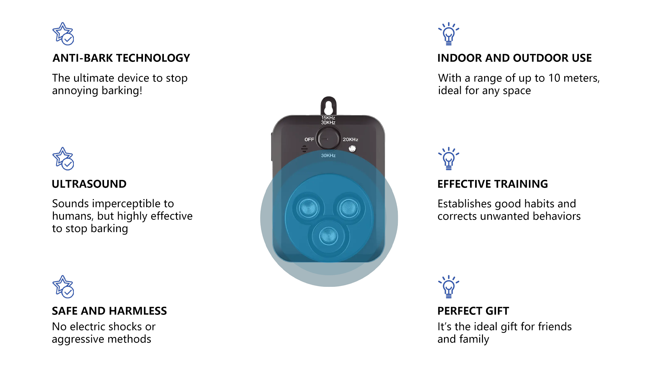 - Safe Ultrasonic Technology — Stops barking without harming your dog and is safe for humans.