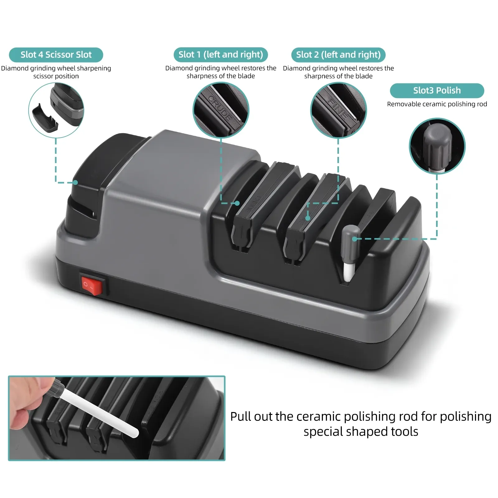 - Dedicated Scissor Slot (Tungsten Steel) – Precisely sharpens scissors for clean cuts with less effort.